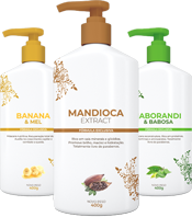 Mandioca Extract. Rico em Sais Minerais e Glicídios, promove o brilho, maciez e hidratação. Totalmente livre de parabenos.